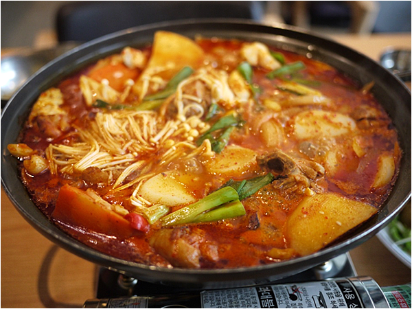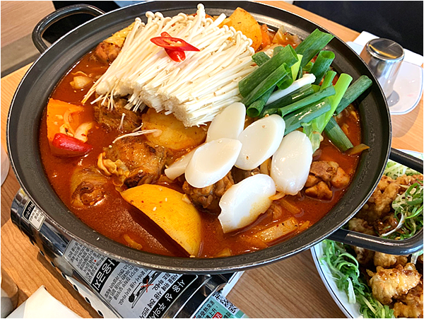 裡面滿滿的帶骨雞肉跟馬鈴薯,還有一些配菜及年糕,雞肉燉的很軟嫩,很快就可以肉骨分離,湯底整體而言會比中式的雞湯重口味一些,雞湯的香味配上有點辣辣的湯汁,比較適合淋在飯上,最貼心的是他馬鈴薯切得比較大塊,怕燉到爛爛的馬鈴薯會化在湯裡,影響湯底的口感(*´∀`)~♥,推薦重口味的朋友一定要來嘗試唷。