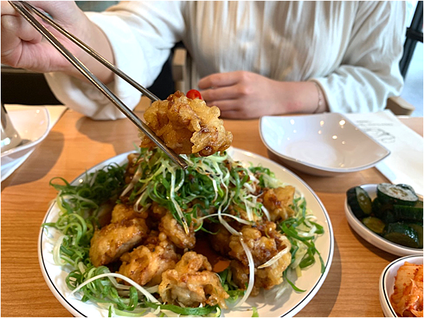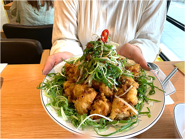 炸雞一號的男友視角(●´ω`●)ゞ,滿滿的蔥絲店家真的不手軟,炸雞還淋上一些獨家醬汁,讓酥酥脆脆的麵衣增加更多層次,雞肉肉質很軟嫩,但要小心不要吃太快,裡面的肉汁可是會燙口的ლ(́◕◞౪◟◕‵ლ)